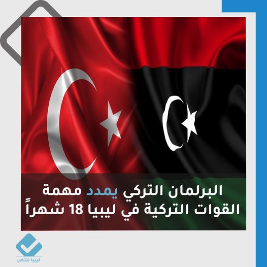 وافق البرلمان التركي أمس الثلاثاء على مذكرة تمديد مهمة القوات التركية في ليبيا 18 شهرا، اعتبارا من الثاني من يوليو المقبل.
